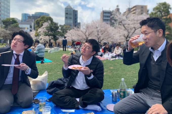 4月の社内行事はお花見です。 墨田区の錦糸公園で従業員でお花見をしました。 購入した食べ物は全て墨田区の名店ばかり。花より団子なひと時を過ごしました。