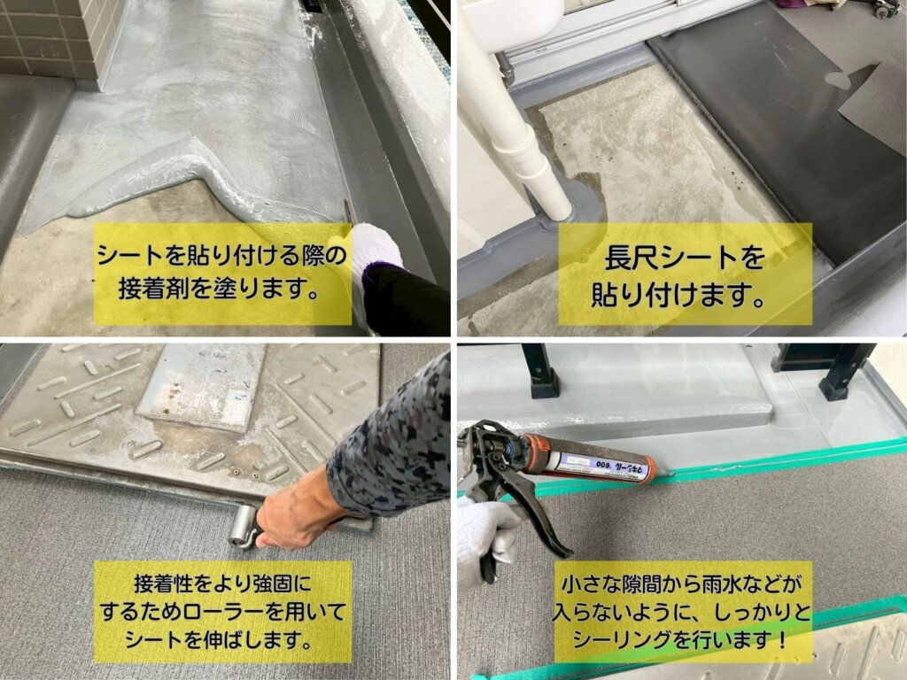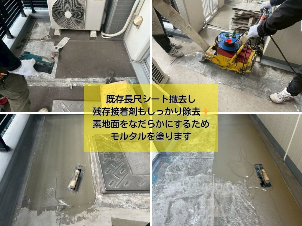 前回載せた東京都葛飾区にある RC造15階建てマンションにて実施した大規模修繕工事の中から、今回は 長尺シート工事(バルコニー・階段・共用廊下)のより詳しい施工内容をお届けします。