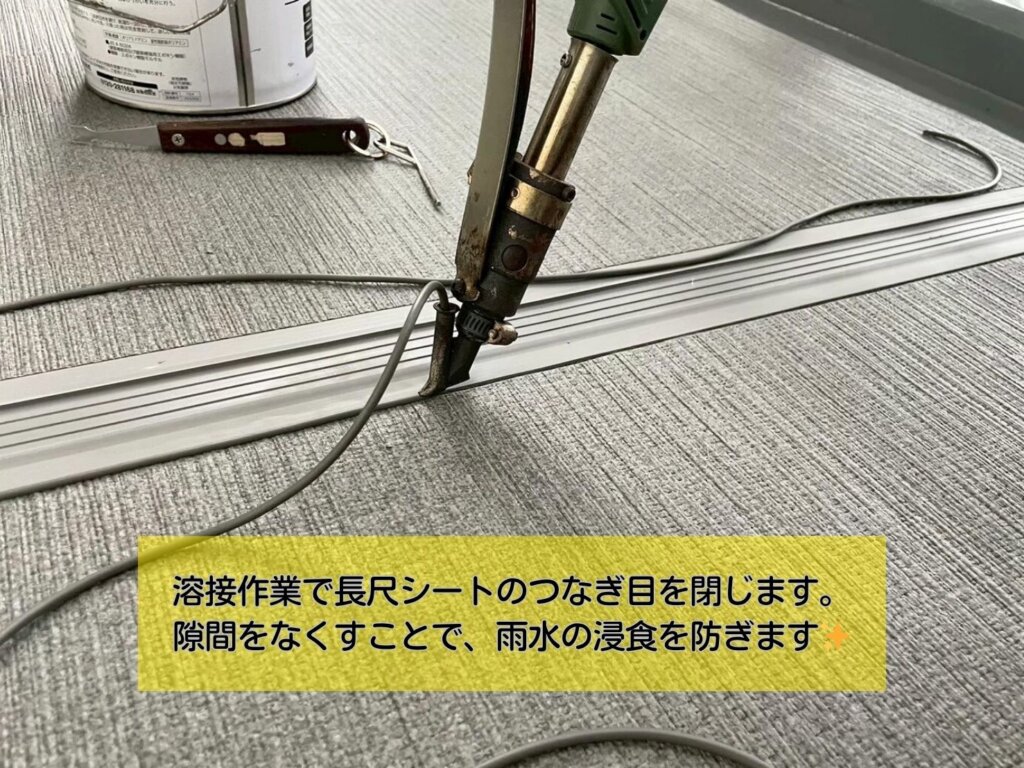 経年劣化により、シートのめくれや摩耗、端部はシーリングが打たれていない箇所が見られました。