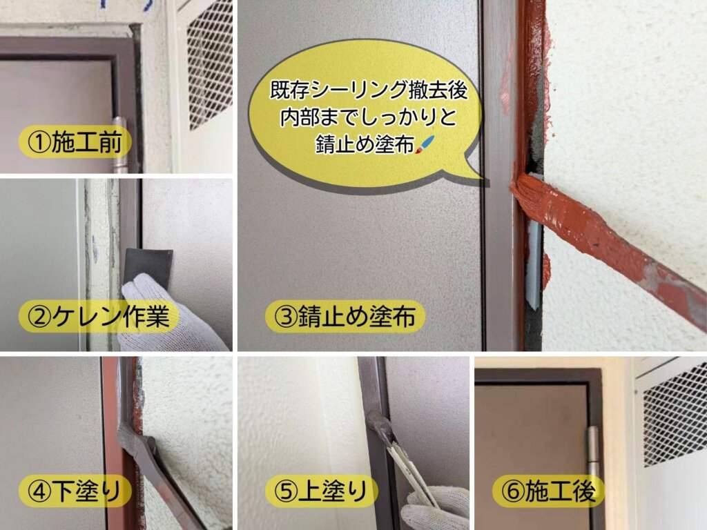 枠組みと取り合いは基本的にシーリングが施されており、シーリングを撤去したタイミングで内部までしっかり塗装できるため、“今” が最も防錆効果の高い施工時期と判断し、建物を長く良い状態で保つため、ご説明、ご理解をいただいたうえで、今回あわせて鉄部塗装も実施しています。