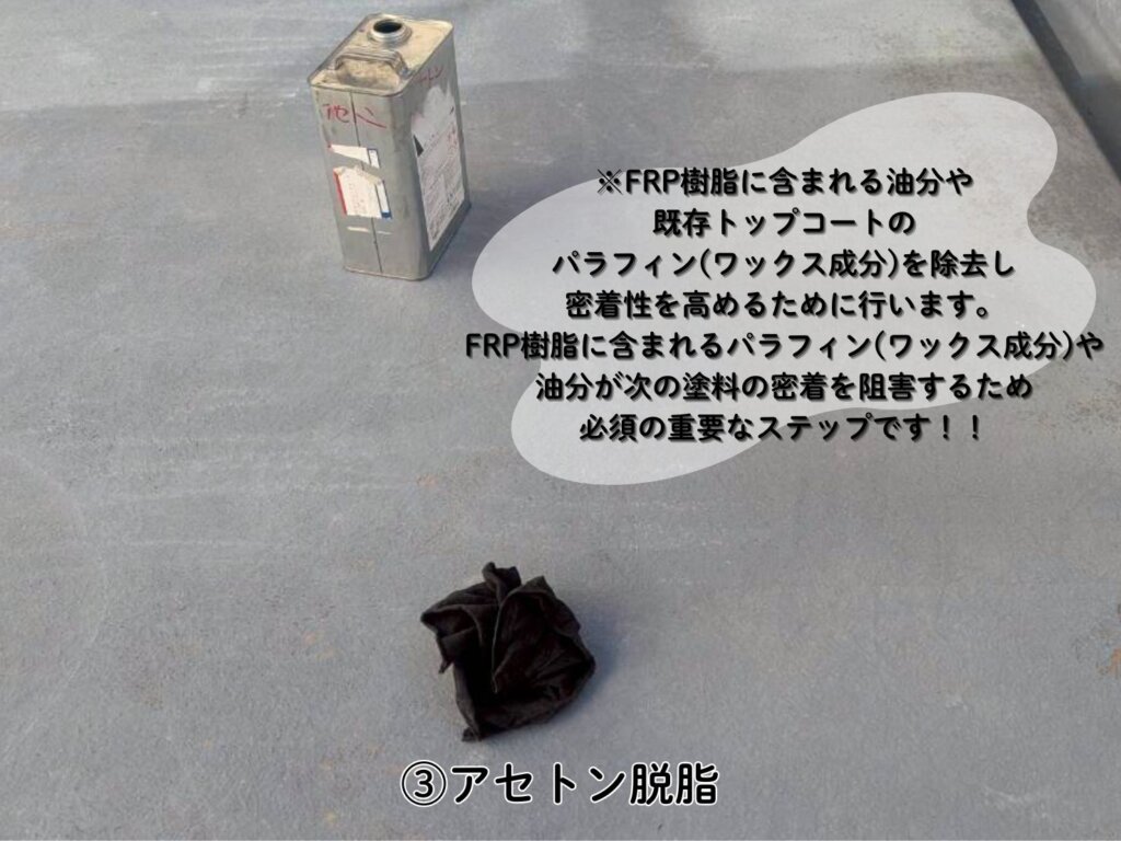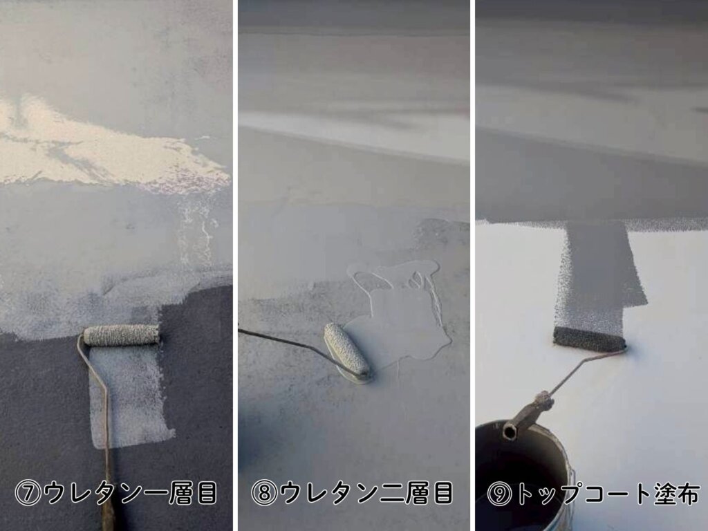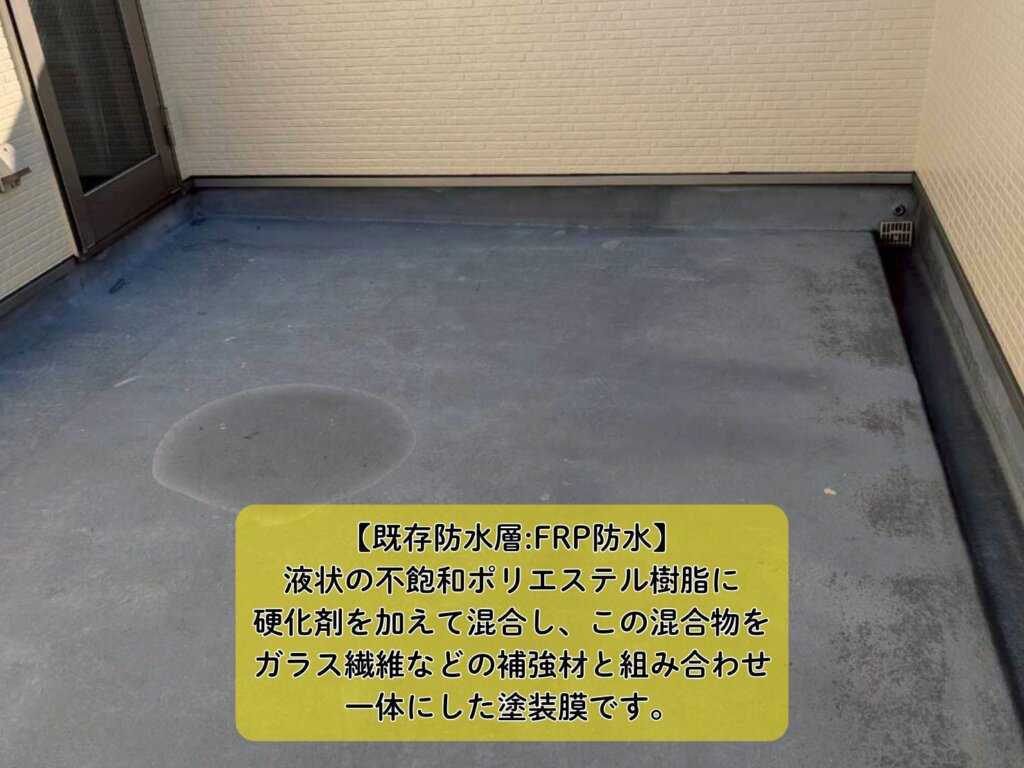 既存の防水層はFRP防水でしたが、劣化の状況を確認したうえで、建物の状態に合わせた防水仕様として、ウレタン防水による改修工事を行いました。